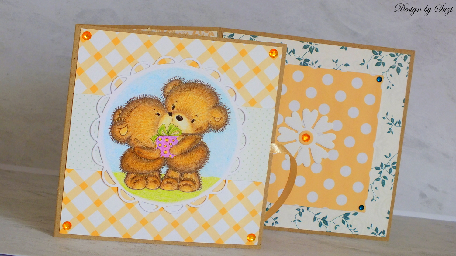 Rok sa s rokom zišiel a môj synovec oslavoval druhé narodeniny. Minulý rok dostal pohľadnicu k meninám, tento rok bola rozhodne v pláne tá narodeninová. Vybrala som si digitálnu pečiatku od Di´s digi stamps a keďže ju bolo treba v pláne vyfarbiť, snažila som sa s tým začať včas. Na vyfarbovanie som použila Koh-i-Noor Polycolor 72 a veru mi medvedíci dali zabrať. Pohľadnicu som ladila k torte, ktorú som už mala naplánovanú a načrtnutú 😊. Na vnútorné stany som symetricky dala rovnaké papiere s kvietkom a kamienkami, pečiatku s dvojkou z vianočného setu od Aladine (použité v adventnom kalendári) a prianie, na ktoré sa vzťahujú autorské práva, lebo je písaná na mieru 😁. K prianiu som doladila obálku, aj keď už len s pečiatkou v surovej čiernobielej verzii.